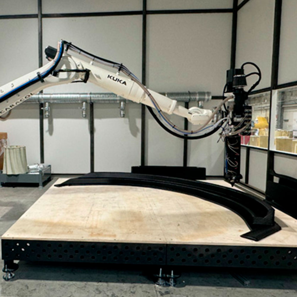 Robot d’impression 3D par pultrusion de thermoplastique renforcé carbone (volume 6 × 2 × 2 m) pour outillages de production grands formats et réactivité projet/programme.